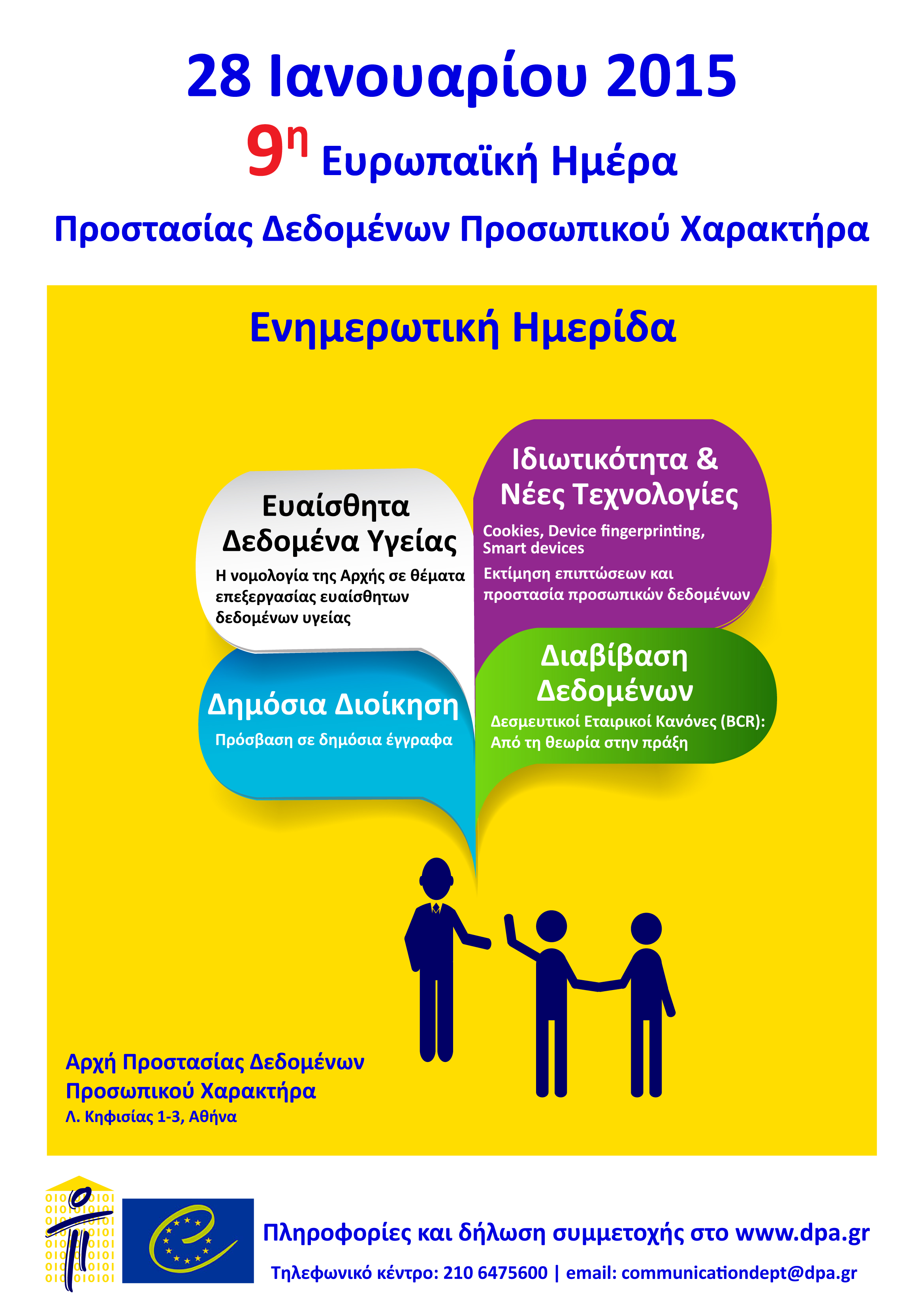 Με αφορμή την 9η Ευρωπαϊκή Ημέρα Προστασίας Προσωπικών Δεδομένων 2015, η Αρχή Προστασίας Δεδομένων Προσωπικού Χαρακτήρα πραγματοποιεί τις εξής δράσεις: